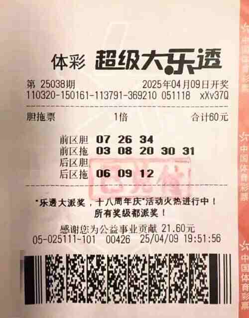 4月9日,大乐透第25038期迎来开奖时刻,在大乐透8.8亿元大派奖活动的强力加持下,苏州一位幸运购彩者成功将29万余元奖金收入囊中。