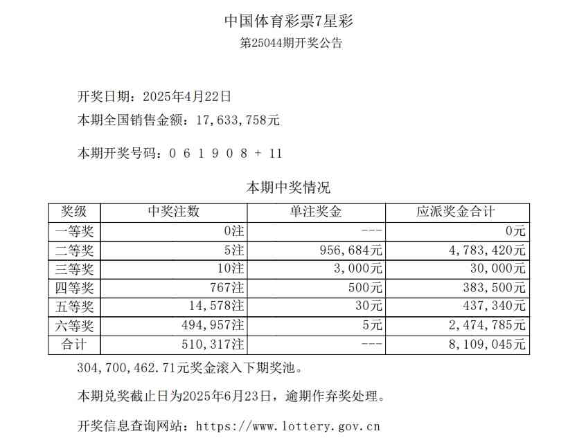 • 7星彩第25044期一等奖空开 奖池3.04亿元