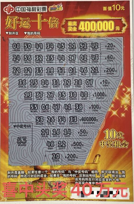 3月16日那天,杨先生恰逢休假,他悠然地来到44140206福彩销售站点,一出手便买了10张“好运十倍”刮刮乐即开票,准备好好享受一番刮奖的乐趣。“我平时都是买两三张玩玩,那天心情特别好,就多买了几张。”他回忆道。“刮开前7张,只中了一两个小奖,我还以为今天运气一般呢。当我拿起第八张开始刮时,当‘中奖号码’的‘53’映入眼帘,再刮开‘我的号码’,竟然也发现了‘53’,那一刻,我的心都提到了嗓子眼。再刮开对应的中奖奖金,竟然是‘¥400,000’!我激动得一下子跳了起来,当时脑袋一片空白,反复确认了好几遍,才敢相信自己真的中了大奖!”杨先生回想起中奖的那一刻,依然兴奋不已。