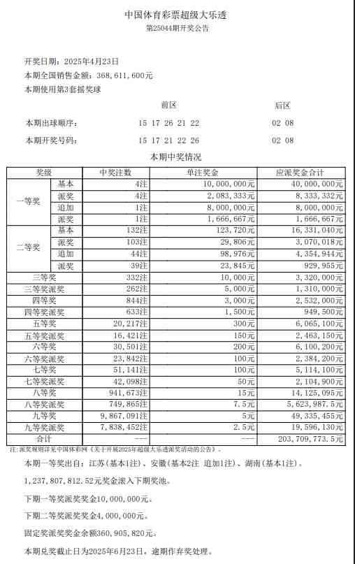 本期全国共开出4注一等奖,单注奖金1000万元,其中1注为追加投注,多得800万元奖金。本期共开出1注追加头奖派奖,单注2175万元花落安徽;3注基本头奖派奖,单注1208万余元,分落江苏、安徽和湖南。