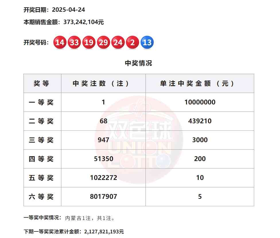 当期双色球一等奖中出1注,花落内蒙古,单注奖金1000万元。