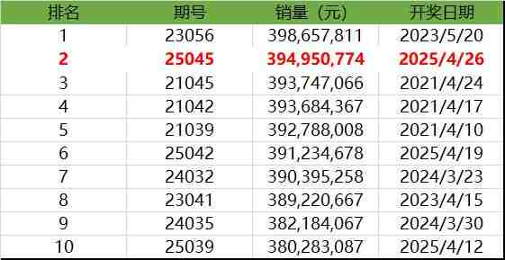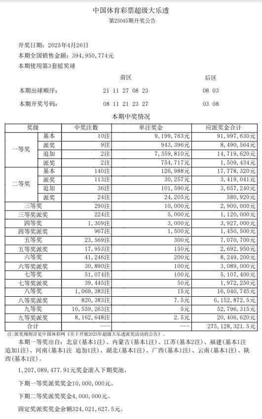 本期全国销量为3.94亿元,奖池方面,本期开奖结束后,12.07亿元滚存至4月28日(周一)开奖的第25046期。