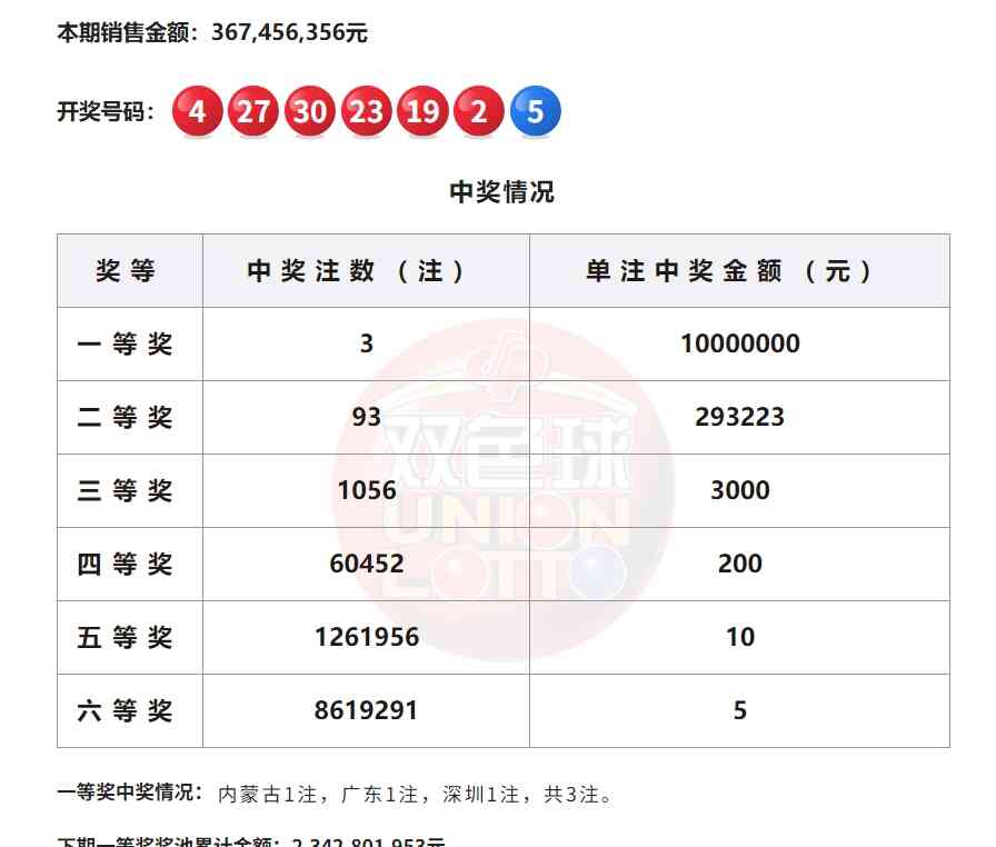 二等奖中出93注,单注奖金为29万余元。六等奖中出861万余注。