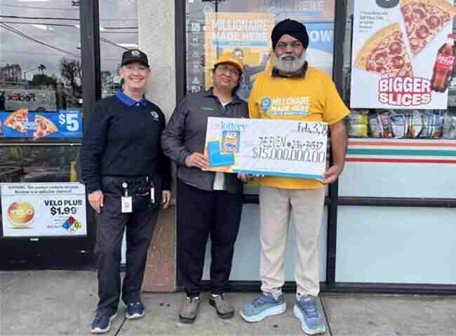 为庆祝这一喜事,加州彩票官方特意向售出彩票的7-11便利店颁发了7.5万美元奖金。颁奖现场,加州彩票官方代表南希 - 韦默(Nancy Weimer)与7-11店长卡拉姆 - 辛格(Karam Singh)亲切合影留念。
