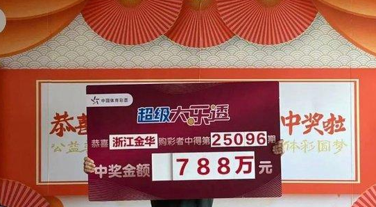 8月23日,体彩大乐透第25096期开奖,全国共中出12注一等奖,每注奖金769万元。浙江金华的一位购彩者通过一张9+3复式票赢得了一注一等奖,单票奖金为788万元,但由于未进行追加投注,错失了追加奖金。8月25日,中奖者杨先生(化名)与几位朋友一同前往浙江省体育彩票管理中心领取了大奖。