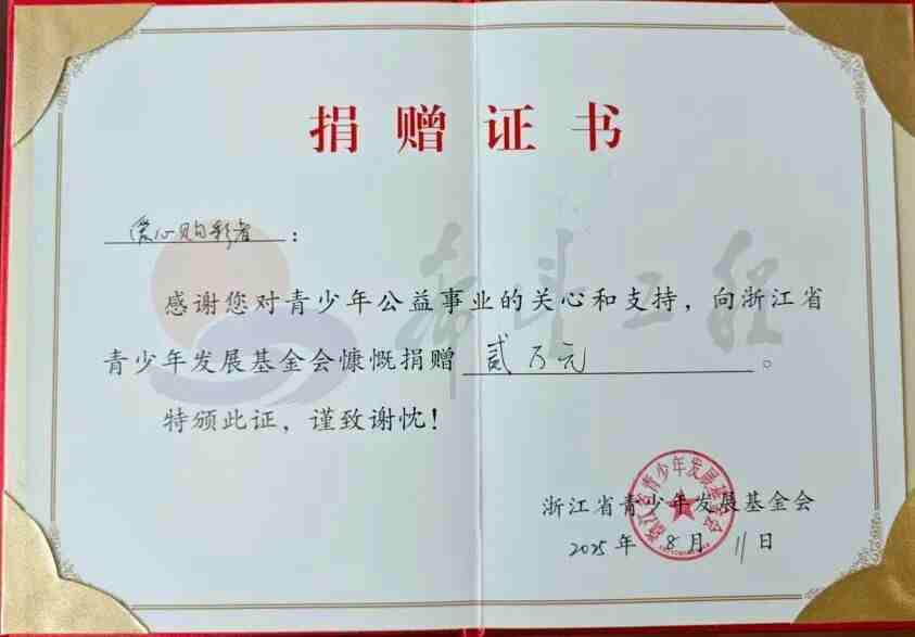 据了解,开奖当日刘先生正在外地出差,得知自己中奖后,他立刻赶回宁波,并将这一喜讯第一时间告诉了爱人。在领奖现场,当了解到浙江体彩为体育事业和社会公益事业作出的贡献后,刘先生深受感动,当即决定向浙江省青少年发展基金会捐赠20000元,希望这笔善款能够帮助更多孩子茁壮成长。
