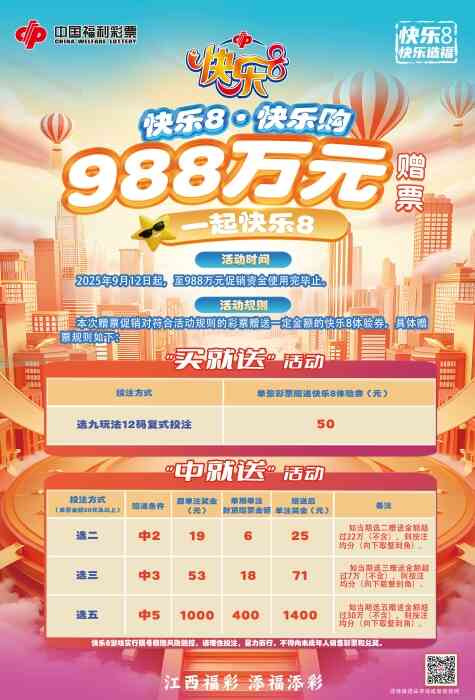 •   福彩快乐8,向快乐出发!9月12日起,江西福彩在全省开展“快乐8·快乐购”988万元赠票活动,对快乐8游戏“选九玩法12码复式”投注彩票“买就送”,对快乐8游戏单票金额20元及以上的“选二”“选三”“选五”玩法的中奖彩票“中就送”。