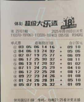 •   9月3日,体彩超级大乐透第25101期迎来开奖时刻,日照一位幸运购彩者凭借一张30元的“一票10注”追加投注票,成功揽获追加二等奖一注,收获奖金高达16.4万余元。