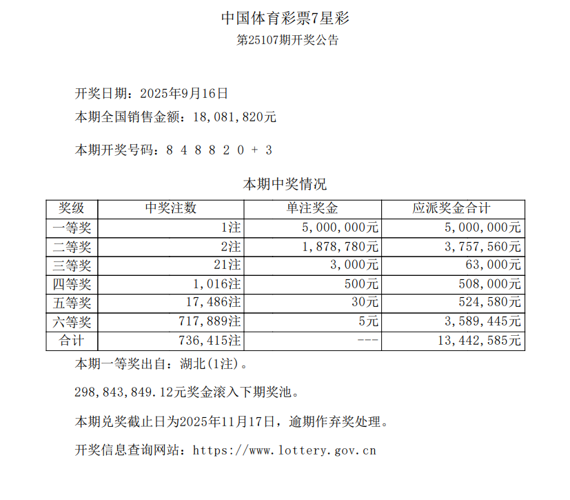 • 7星彩第25107期一等奖一注 奖池2.98亿元