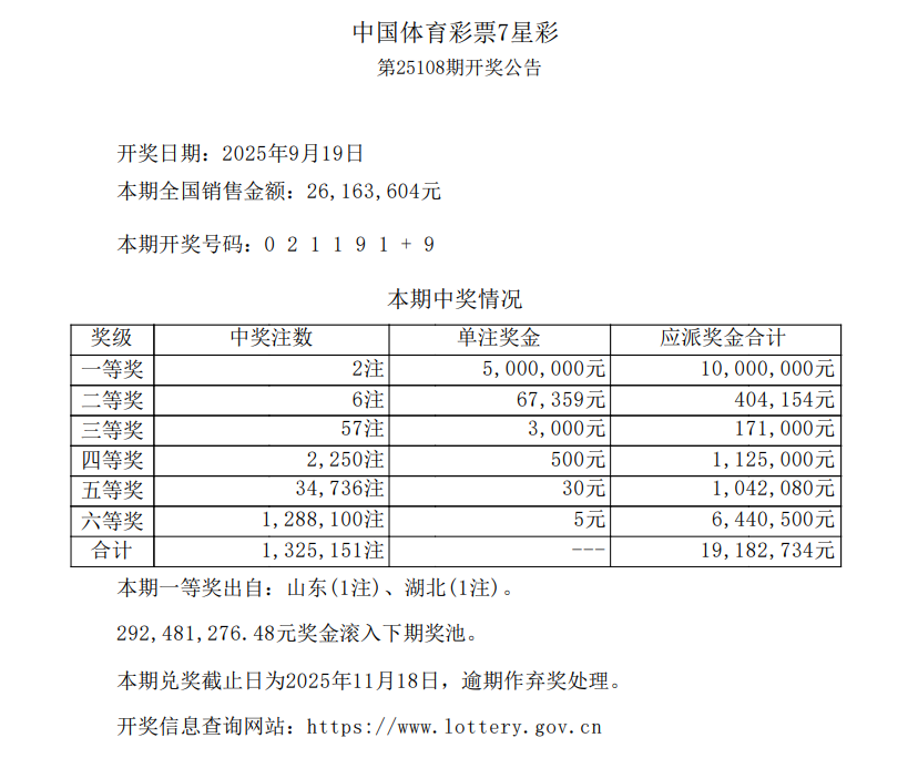 • 7星彩第25108期一等奖二注 奖池2.92亿元