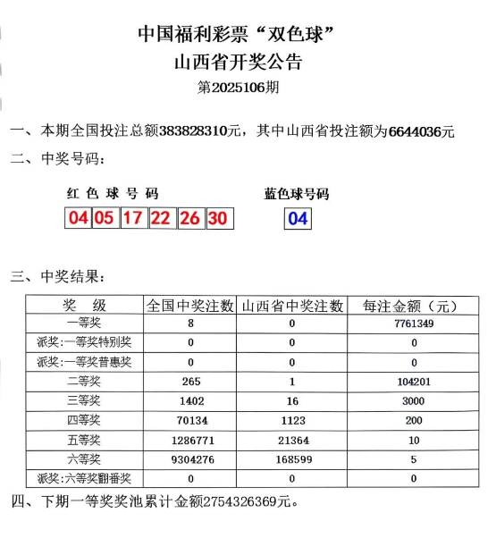 晋城市泽州县下村镇下村村,14050139号投注站,以一张10元双色球单式5注票,中得1注二等奖,奖金总计104201元。
