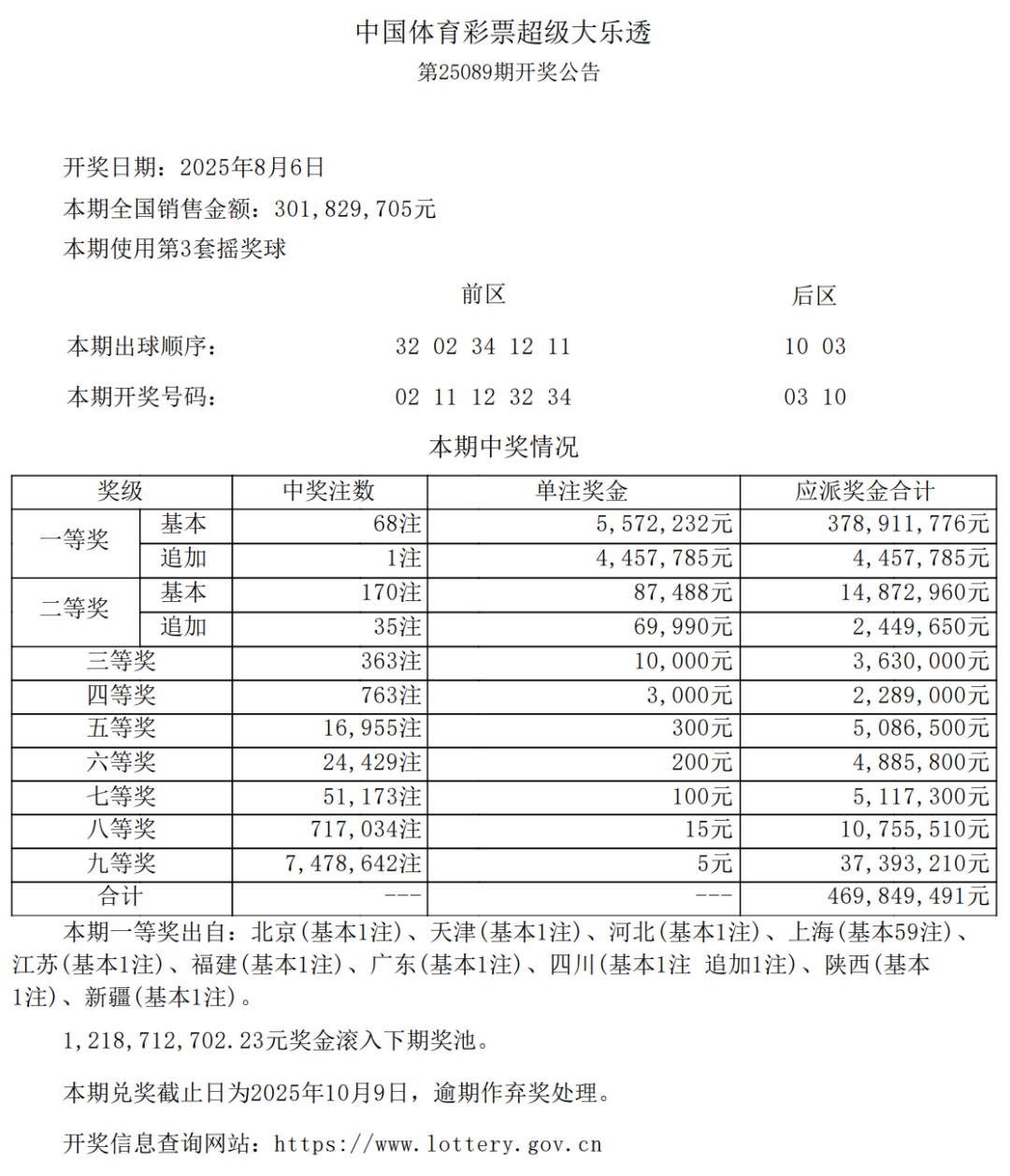 •   8月6日,超级大乐透第25089期进行了开奖。本期前区中奖号码为02、11、12、32、34,后区中奖号码为03、10。全国总销售额达到3.01亿元,为国家筹集了1.08亿元的彩票公益金。