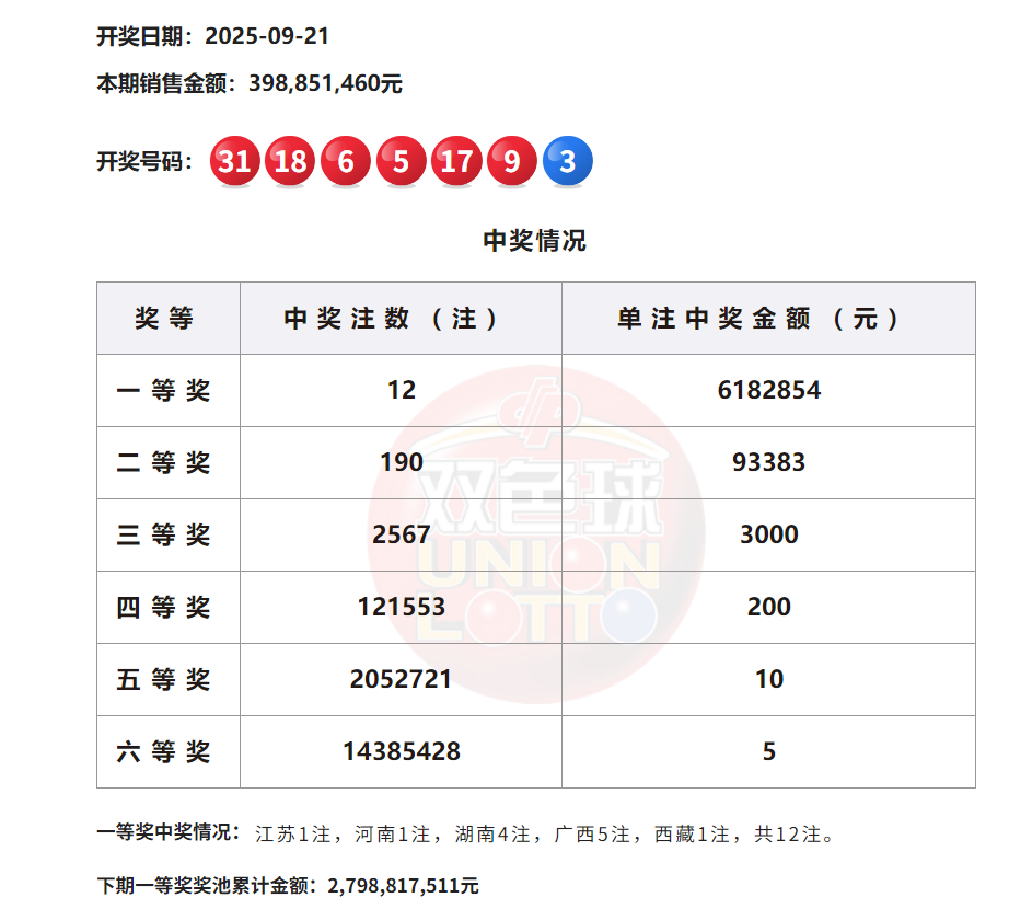 当期双色球一等奖中出12注,其中江苏1注、河南1注、湖南4注、广西5注、西藏1注,单注奖金618万元。