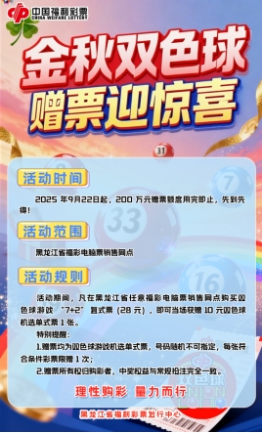 •   2025年9月22日,黑龙江省福彩中心2025年双色球游戏赠票营销活动正式启动。从今日起,凡购买指定双色球复式彩票的购彩者,即可获赠额外机选票。