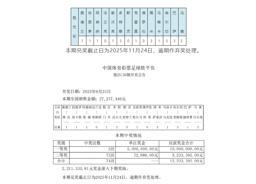 •   北京时间9月23日,胜负彩第25136期开奖结果揭晓。本期足彩头奖仅开出2注,单注奖金500万元,221万余元滚存至下期奖池;二等奖开出72注72,686元;任九开1031注14,252元。本期足彩销量为27,257,446元,任九投注总额为22,960,506元。