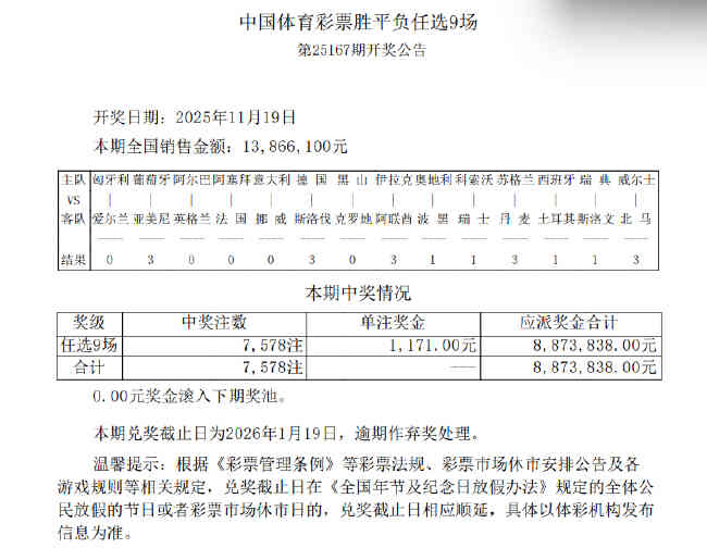 •   北京时间11月19日,胜负彩第25167期任九开奖结果揭晓。本期任九开出7578注,单注奖金1171元,本期任九的投注总额为13,866,100元。