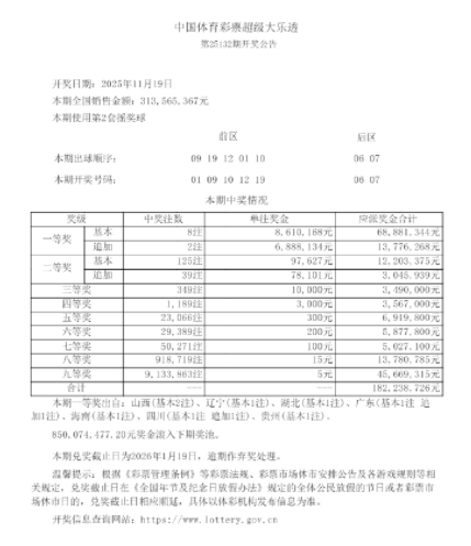 本期全国销量为3.13亿元,奖池方面,8.5亿余元滚存至11月22日(周六)开奖的第25133期。