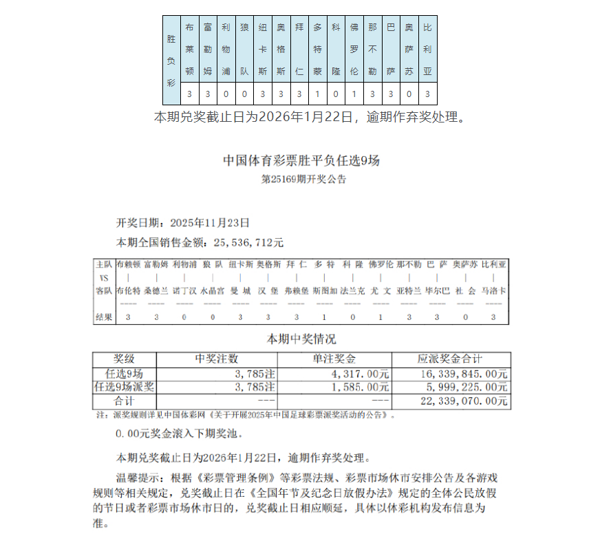 •   北京时间11月23日,足彩第25169期任九开奖结果揭晓。本期为足彩派奖首期,任九开出3785注4317元,因派奖每注可多得1585元,单注共计5902元。本期任九投注总额为25,536,712元。