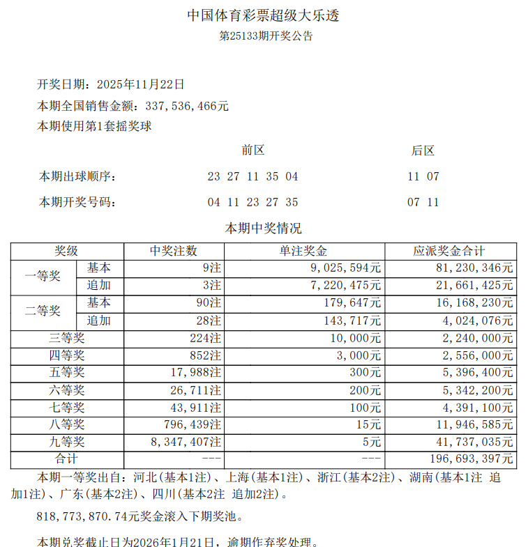 •   11月22日,超级大乐透第25133期开奖。前区开出号码04、11、23、27、35;后区开出号码07、11。本期全国销售3.37亿元,为国家筹集彩票公益金1.21亿元。
