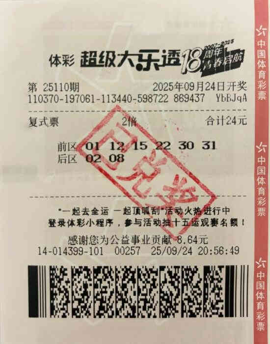 大乐透第25110期的中奖号码为“01 15 22 30 31 + 02 08”,本期全国共开出6注基本投注一等奖,其中2注幸运降临山东济宁,被王先生收入囊中。