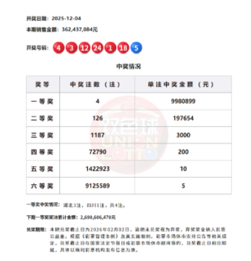 22:08 本期一等奖开出4注,单注奖金998万余元分落2地,其中湖北独揽3注,若为1人所中,那么该彩民将收获2994万的超级大奖,剩余1注头奖出自四川。二等奖开出126注,单注奖金19.7万余元。本期双色球全国销量为3.62亿余元,计奖结束后奖池余额为26.9亿余元。