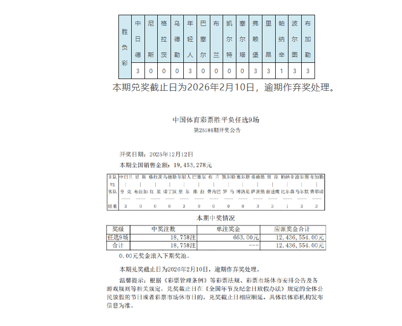 •   北京时间12月12日,胜负彩第25184期任九开奖结果揭晓。本期任九共开出18,758注,单注奖金663元。本期任九投注总额为19,453,278元。
