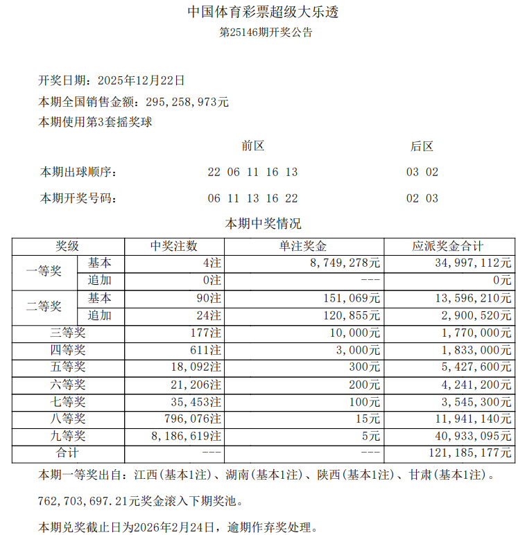 •   12月22日,超级大乐透第25146期开奖。前区开出号码06、11、13、16、22;后区开出号码02、03。本期全国销售2.95亿元,为国家筹集彩票公益金1.06亿元。