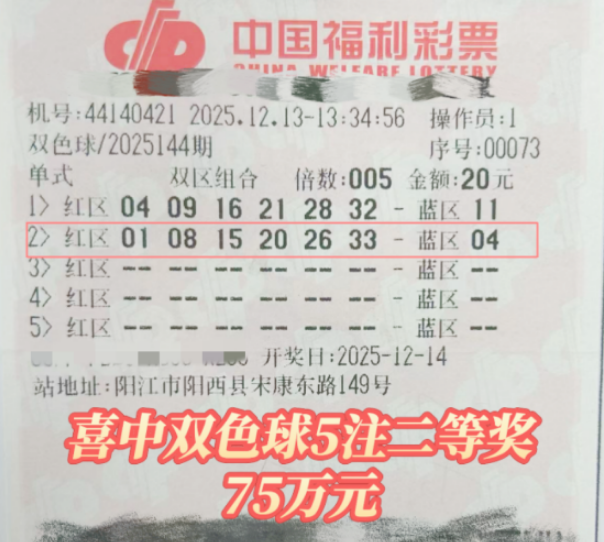 •   12月14日,中国福利彩票双色球游戏第2025144期开奖,全国一等奖中出18注,二等奖中出180注。在这场幸运的盛宴中,阳江市44140421福彩销售站点脱颖而出,有5注二等奖花落此处。中奖彩票是一张投注金额20元的2注5倍单式票,中奖总金额达75.7万元。