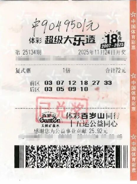 11月24日,超级大乐透第25134期开奖结果揭晓。前区号码为07、12、18、27、33,后区号码为09、10。全国范围内共开出8注一等奖,其中1注幸运大奖被汕尾揽入怀中,中奖站点是位于汕尾海丰人民西路南门花园C2栋3号的4413030481体彩实体店。幸运购彩者罗先生(化姓)凭借一张72元的复式票,成功斩获当期一等奖,单票奖金高达904万余元,同时为当地贡献了180万余元的税收。