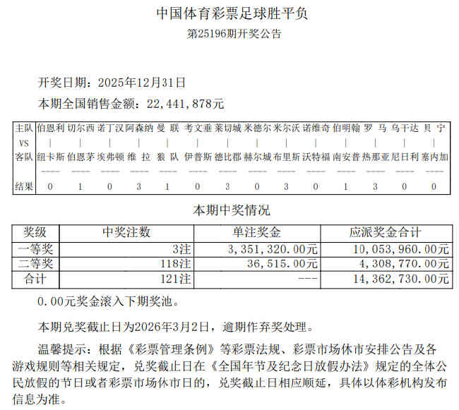 •   北京时间12月31日,胜负彩第25196期开奖结果揭晓。本期足彩头奖共开出3注,单注奖金3,351,320元;二等奖开出118注36,515元;任九开929注13,024元。本期胜负彩销量为22,441,878元,任九投注总额为18,905,172元。