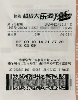 •   12月13日,超级大乐透第25142期开奖,开奖号码为09、10、14、27、29 + 02、09。临沂沂水县一位幸运儿凭借一张12元的复式投注彩票,成功将1注1000万元的大乐透一等奖收入囊中,瞬间成为众人艳羡的焦点。