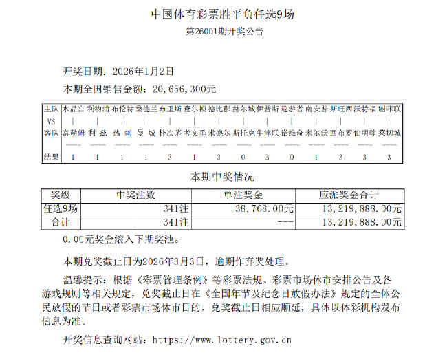 •   北京时间1月2日,胜负彩第26001期任九开奖结果揭晓。本期任九开出341注,单注奖金38,768元,本期任九的销量为20,656,300元。
