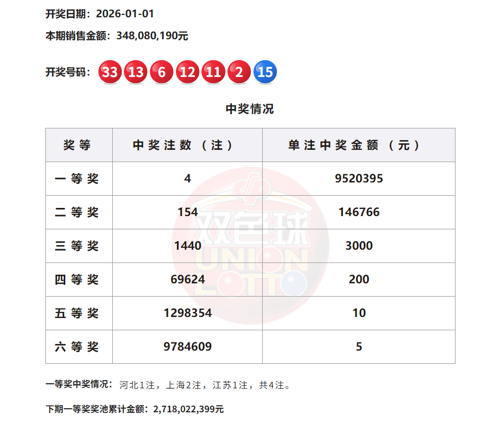 当期双色球一等奖中出4注,分落河北1注、上海2注、江苏1注,单注奖金952万元。