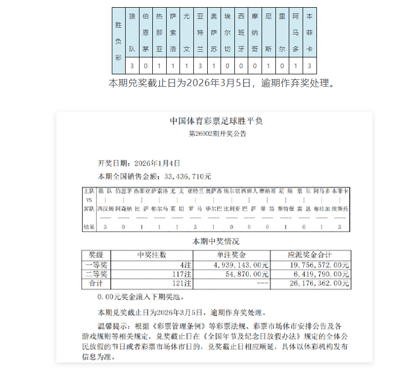 •   北京时间1月4日,胜负彩第26002期开奖结果揭晓。14场1等开出4注,单注奖金493万多元,此前477万滚存被清空;14场2等开出117注,单注奖金54870元;任九开出631注,单注奖金24153元。本期胜负彩销量为33,436,710元,任九投注总额为23,814,200元。