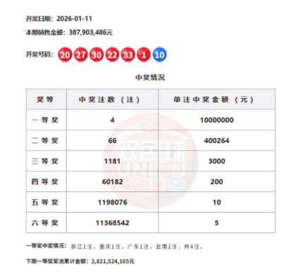 22:10 本期一等奖开出4注,单注奖金1000万元,4注头奖分落4地,浙江、重庆、广东、云南各1注。二等奖开出66注,单注奖金40万余元。本期双色球全国销量为3.87亿余元,计奖结束后奖池余额为28.21亿余元。