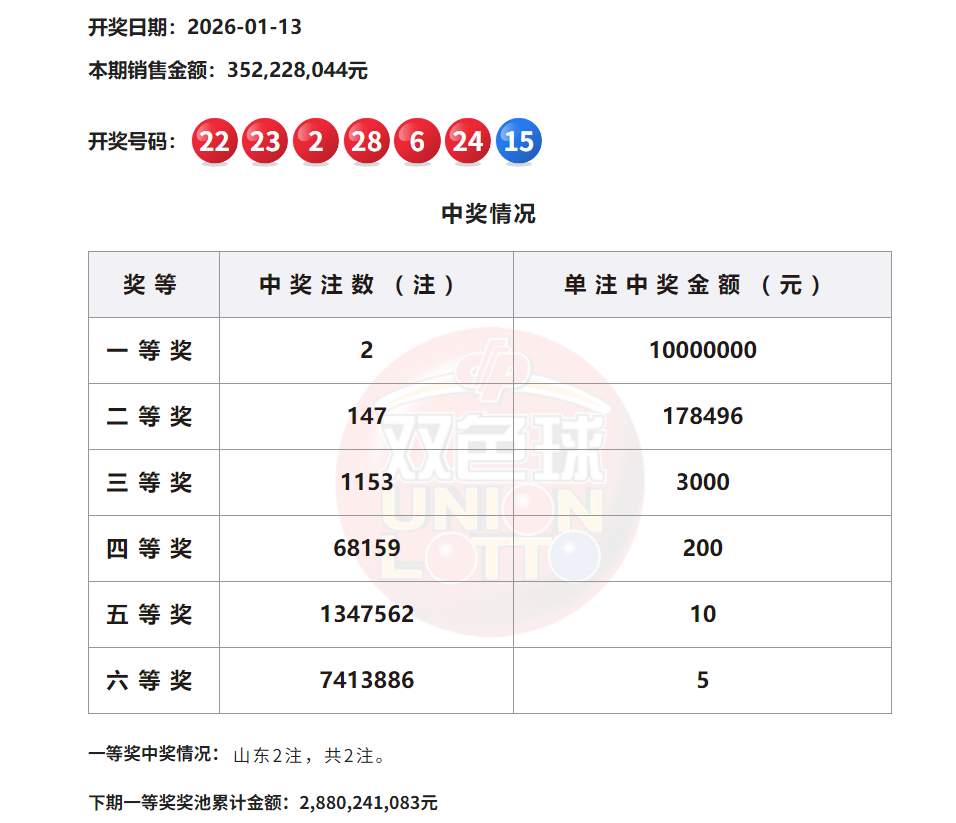 当期双色球一等奖花落山东,共2注,单注奖金1000万元。