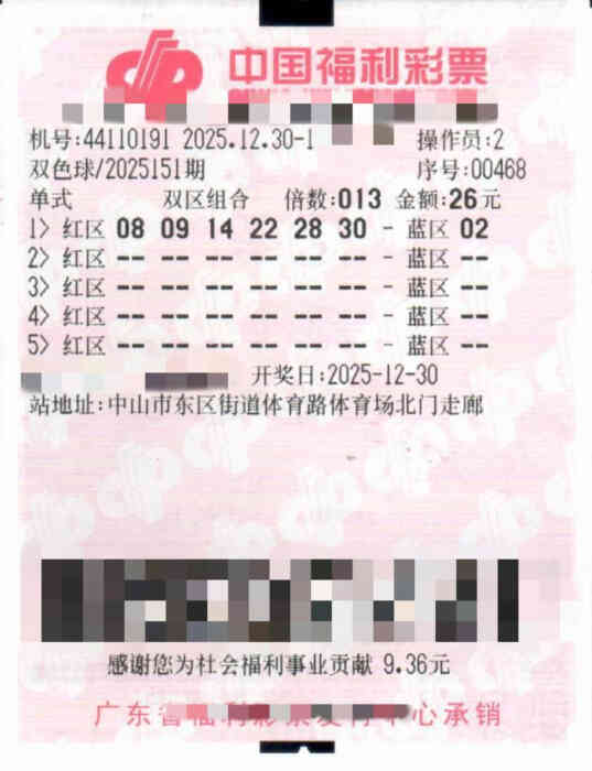 2025年12月30日,中国福利彩票“双色球”第2025151期开奖结果揭晓,全国共中出二等奖125注,其中13注幸运降临中山市东区街道体育路44110191福彩销售站点。中奖彩票是一张26元的1注号码13倍倍投票,一举揽获13注二等奖,奖金总额达213多万元。