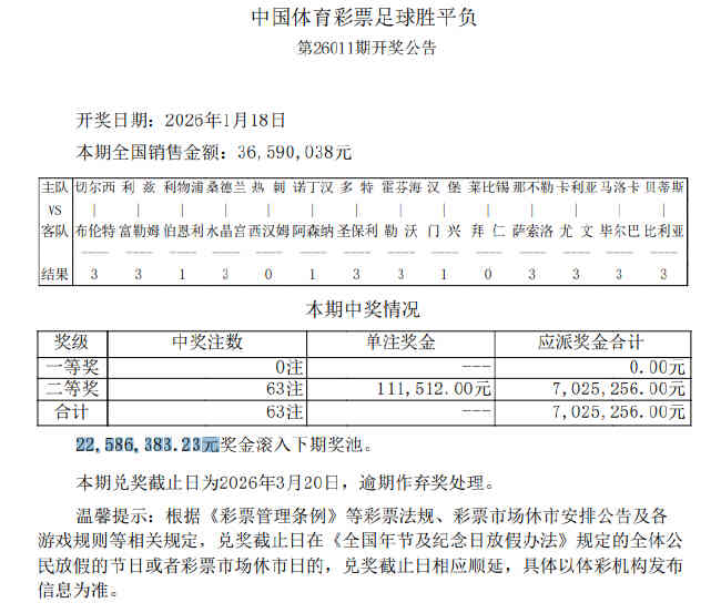 • 滚存2258万!足彩头奖空开 二等奖开63注11.1万