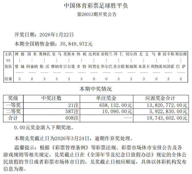 •   北京时间1月22日,足彩第26013期开奖结果揭晓。本期足彩头奖共开出21注,单注奖金658,132元;二等奖开出587注10,090元;任九开3121注3629元。本期14场销量为30,849,972元,任九总投注额为17,700,894元。