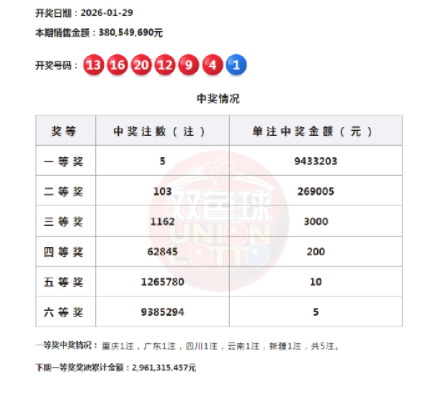 22:05 本期一等奖开出5注,单注奖金943万余元,分落5地,重庆、广东、四川、云南、新建各1注。二等奖开出103注,单注奖金26.9万余元。本期双色球全国销量为3.8亿余元,计奖结束后奖池余额为29.61亿余元。