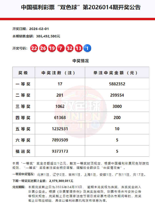 •   北京时间2026年2月1日,福彩双色球第26014期开奖,当期开奖号码为红球07 13 19 22 26 32,蓝球01。本期是2026年双色球实施新规则后第一期开奖,其中一等奖开出17注,因奖金总额超出1亿元,触发一等奖封顶规定,单注奖金588万余元。因开奖前奖池高于15亿,执行特别规定,增设5元福运奖(命中3枚红球即中奖),福运奖开出9373173注。