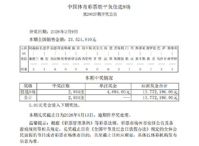 • 足彩26027期任九开奖:共2934注 单注4694元