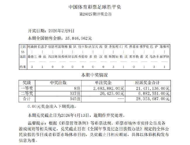 •   北京时间2月9日,足彩第26027期开奖结果揭晓。本期一等奖开出8注,单注奖金2,683,892元,541万滚存被清空;14场二等奖开出337注,单注奖金20,423元;任选九场开出2,934注,单注奖金4,694元。本期14场销量为35,846,962元,任九投注总额为21,521,810元。