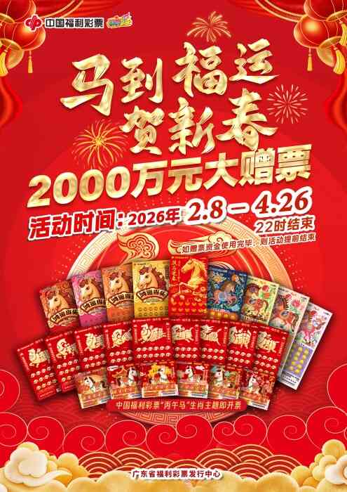 金马报喜,福彩送福。为弘扬春节文化,传递美好祝福,广东省福利彩票发行中心自2026年2月8日0时至4月26日22时在全省范围(不含深圳)开展“马到福运贺新春”赠票营销活动。本次活动共安排2000万元赠票资金,如活动期间,赠票资金提前使用完毕,则活动结束,广东省福利彩票发行中心将向社会发布活动结束公告。