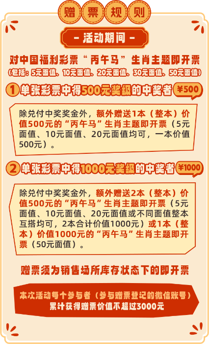 活动期间,对中国福利彩票“丙午马”生肖主题即开票单张彩票中得500元奖级的中奖者,除兑付中奖奖金外,额外赠送1本(整本)价值500元的“丙午马”生肖主题即开票(5元面值、10元面值、20元面值均可,一本价值500元);对中国福利彩票“丙午马”生肖主题即开票单张彩票中得1000元奖级的中奖者,除兑付中奖奖金外,额外赠送2本(整本)价值500元的“丙午马”生肖主题即开票(5元面值、10元面值、20元面值或不同面值整本互搭均可,2本合计价值1000元)或1本(整本)价值1000元的“丙午马”生肖主题即开票(50元面值)。赠票须为销售场所库存状态下的即开票。