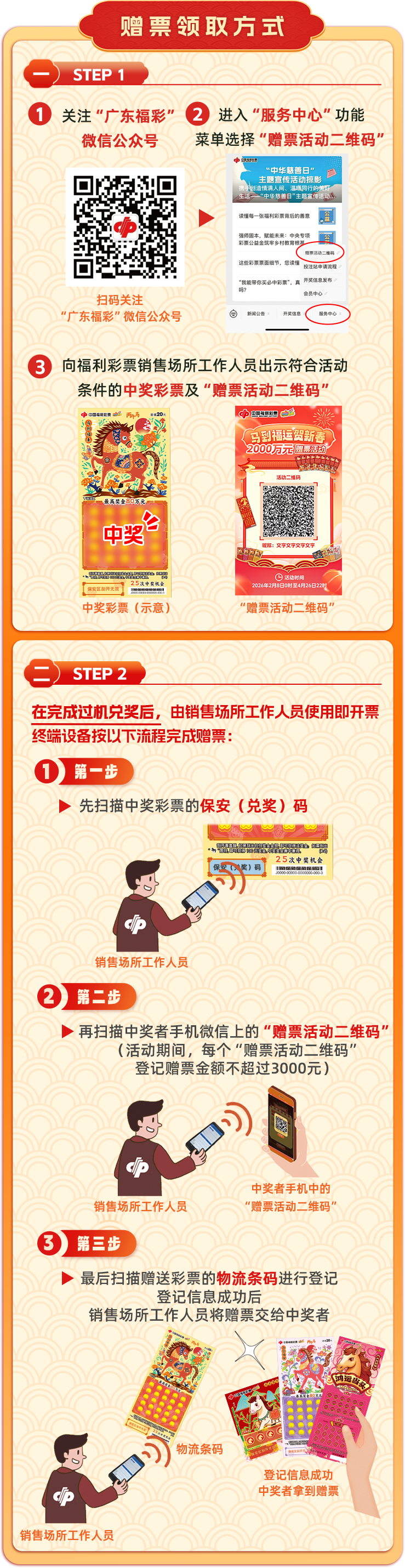 2.在完成过机兑奖后,由销售场所工作人员使用即开票终端设备按以下流程完成赠票:步骤一:先扫描中奖彩票的保安(兑奖)码;步骤二:扫描中奖者手机微信上的“赠票活动二维码”(活动期间,每个“赠票活动二维码”登记赠票金额不超过3000元);步骤三:扫描赠送彩票的物流条码进行登记。登记信息成功后,销售场所工作人员将赠票交给中奖者。