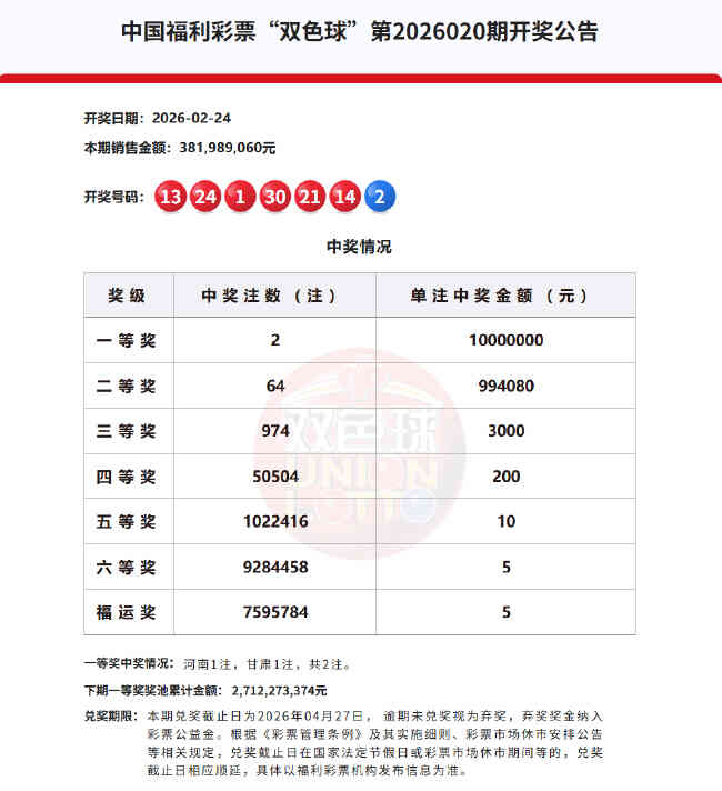 •   北京时间2026年2月24日,福彩双色球第26020期开奖,当期开奖号码为红球01 13 14 21 24 30,蓝球02。本期一等奖仅开出2注,单注奖金1000万元。值得注意的是,本期二等单注奖金99.4万,排名近10年二等奖奖金第1位!TOP10排名如下: