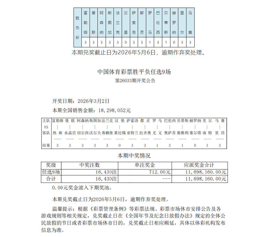 •   北京时间3月2日,足彩第26033期任九开奖结果揭晓。本期任九开出16,430注,单注奖金712元。本期任九投注总额为18,298,052元。