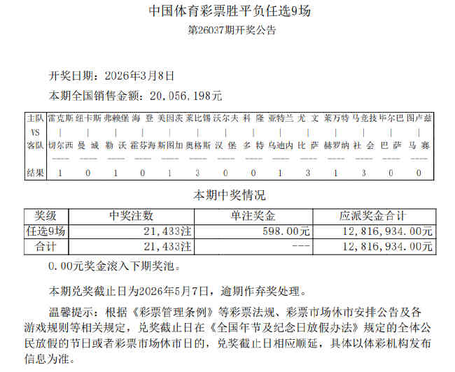 •   北京时间3月8日,足彩第26037期任九开奖结果揭晓。本期任九开出21433注598元。本期任九投注总额为20,056,198元。