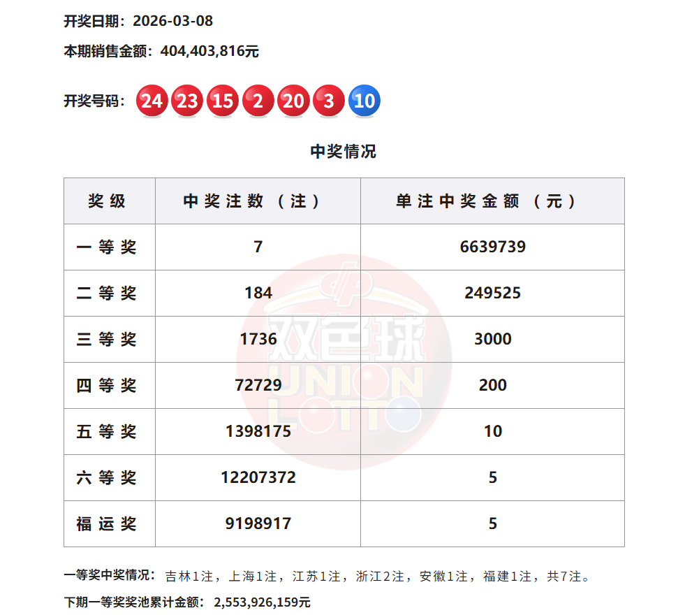• 双色球头奖7注663万分落6地 福运奖开919万注
